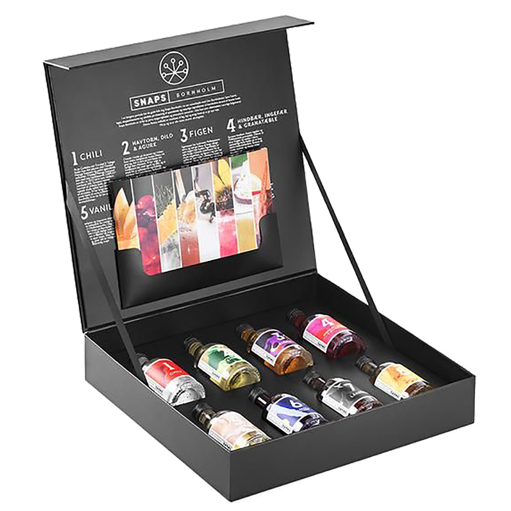 Snaps Bornholm Gaveæsken er lavet til den nysgerrige gane og til bordet, hvor man gerne vil smage sig lidt omkring i stedet for at vælge én retning fra start. Det er en gaveæske med otte miniatureflasker, der spænder fra klassisk dram og krydret snaps til frugtige ginlikører og friske ginvarianter. Den fungerer derfor både som gave, som lille hjemmesmagning og som en elegant måde at finde sin egen favorit blandt Bornholm Spirits’ forskellige udtryk.